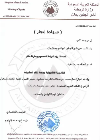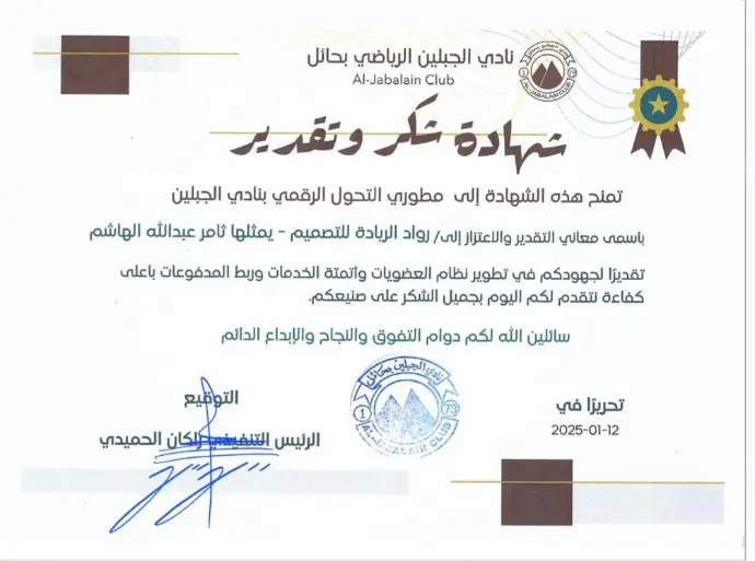 منحتنا إدارة نادي الجبلين شهادة شكر وتقدير نظير تنفيذنا نظام العضويات باحترافية عالية، وتقديم حلول تقنية ساهمت في تحسين إدارة عمليات النادي بشكل فعّال ومنظم.