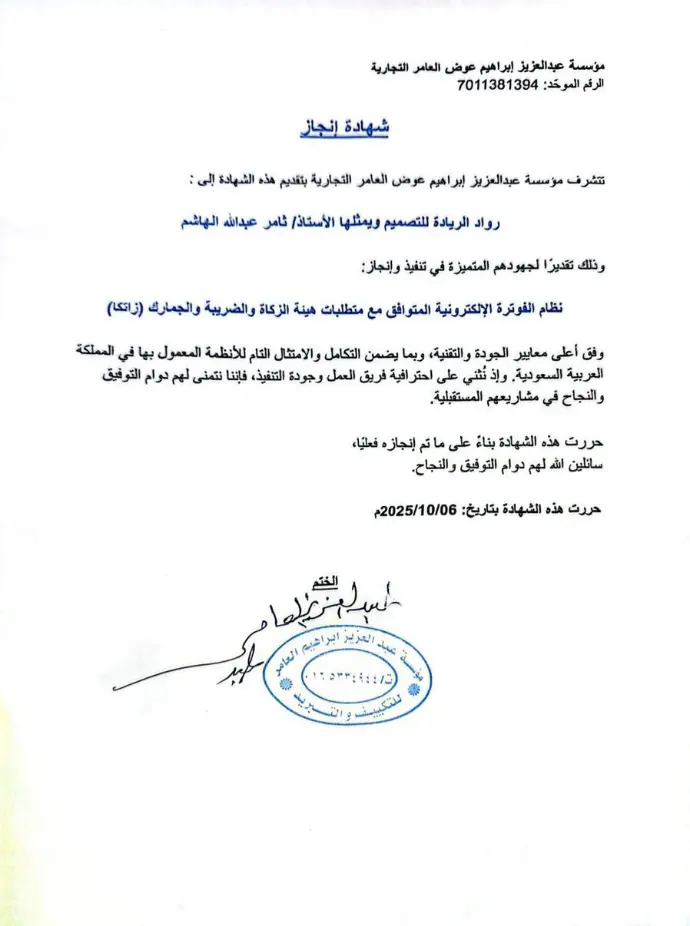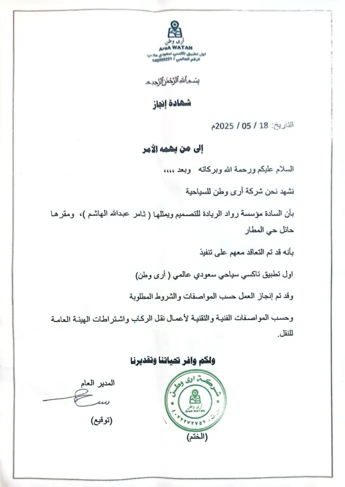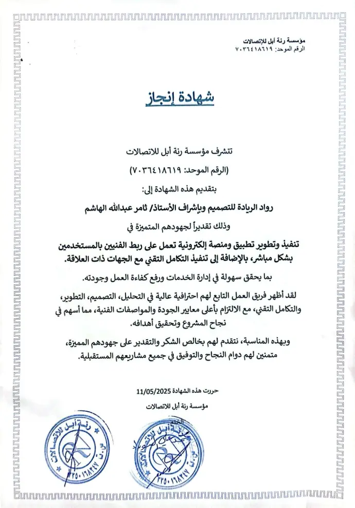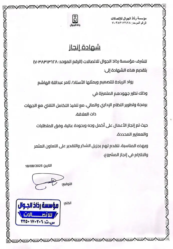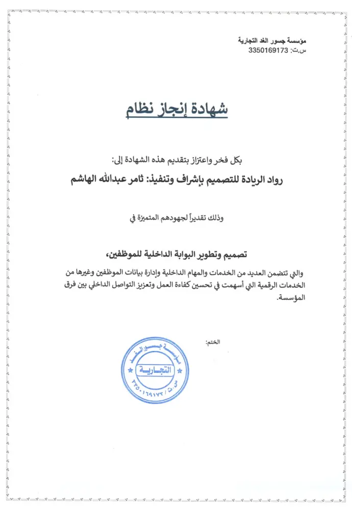 حصلنا على شهادة إنجاز من شركة صهوة نظير جودة العمل، وفعالية النظام في تنظيم أعمال الشركة ورفع كفاءتها التشغيلية.